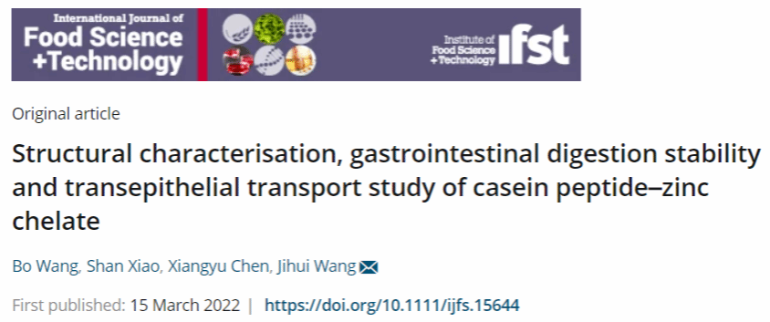 2022年3月,威廉希尔体育化学工程与能源技术公司王波博士(第一作者)在国际食品期刊《International Journal of Food Science and Technology》(IF:3.612, 中科院二区)发表了题为“Structural characterisation, gastrointestinal digestion stability and transepithe-lial transport study of casein peptide–zinc chelate”的研究论文。