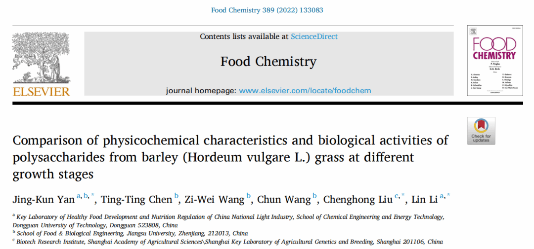 2022年4月,威廉希尔体育食品营养健康工程与智能化加工研究中心闫景坤教授(第一作者)在国际食品顶级期刊《Food Chemistry》(IF: 9.231, Q1)发表了题为“Comparison of physicochemical characteristics and biological activities of polysaccharides from barley (Hordeum vulgare L.) grass at different growth stages”的研究论文。