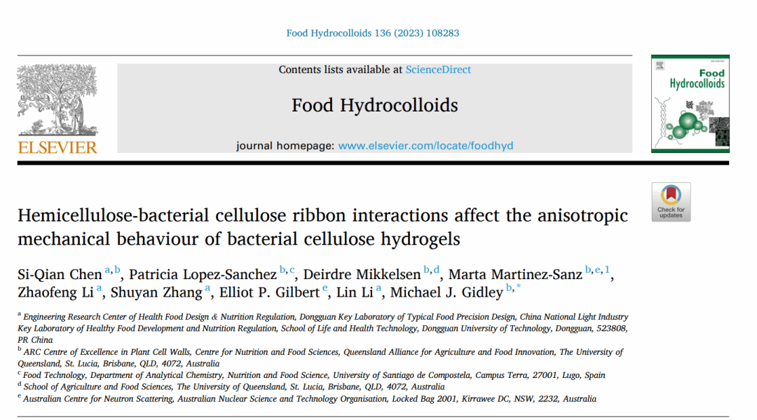 2022年10月,威廉希尔体育食品营养健康工程与智能化加工研究中心陈思谦(第一作者)在国际食品顶级期刊《Food Hydrocolloids》(IF: 11.504, Q1)发表了题为“Hemicellulose-bacterial cellulose ribbon interactions affect the anisotropic mechanical behaviour of bacterial cellulose hydrogels”的研究论文。